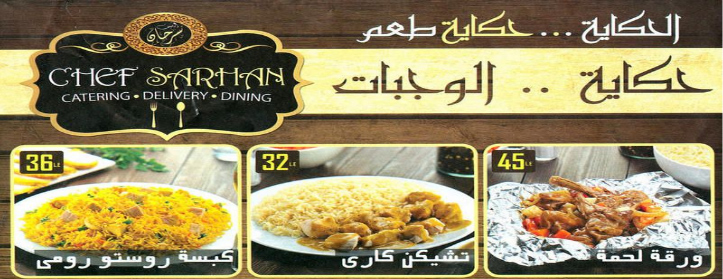 مطعم الشيف سرحان لاطباق اللحوم و الطواجن فلدينا اطباق ورق اللحمة و التشيكن كارى و كبسة الروستو الرومى و الكوبيبا واللحوم المشوية و الطواجن المخصوصة و اطباق الحمام المحشى و انواع الشرب المختلفة و كافة انواع المشروبات بالاضفاة الى اننا لدينا اسطول كامل من عاملى توصيل الطلبات لجميع المناطق